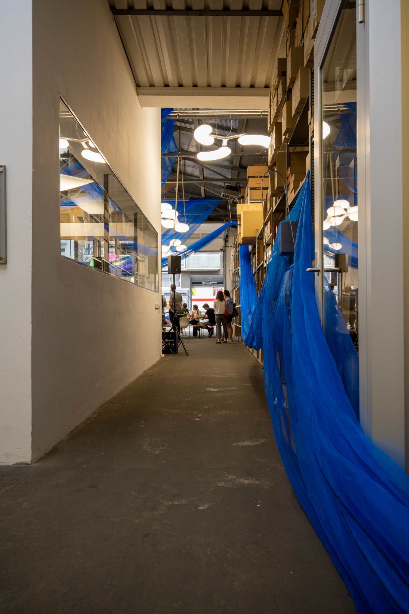 Vom 21. Juli bis 14. Oktober 2022 wurde das Lager des Designleuchtenherstellers Less'n'more GmbH & next im Kölner Stadtteil Braunsfeld Ausstellungsort für raumbezogene Zeichnung und Soundarbeiten: Ausgehend von den Linien, Farben, Materialien und Prozessen vor Ort entwickelten Helena Geisler, Lisa Claire Stolzenberger und Saskia Ackermann eine Ausstellung, die Überlagerung und Vernetzung von künstlerischem Miteinander im alltäglichen und unternehmerischen Nebeneinander thematisierte. Die Zusammenarbeit untereinander und im Miteinander mit dem Designleuchtenlager wird in Form von Papierarbeiten, Rauminstallationen, Malereien und Soundarbeiten zwischen den Designleuchten von Less'n'more und next als Vernetzte Gesten nun sichtbar.